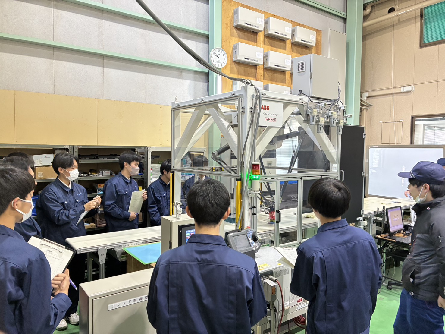 3班に分かれ、「会社説明・システム説明」、「システム実機デモ見学」、「生産・ロボット見学」の3つのブースをローテーションする形での見学を実施しました。
